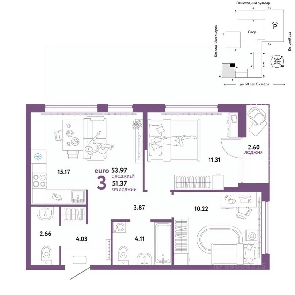 Продается 3комнатная квартира на 21 этаже от застройщика Страна Девелопмент. Площадь квартиры 53,94 кв. м. Стоимость указана без учета акций.