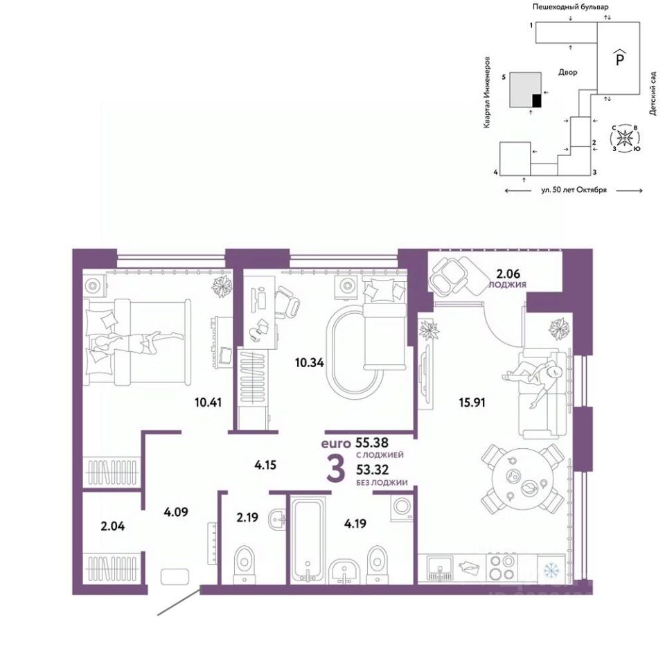Продается 3комнатная квартира на 2 этаже от застройщика Страна Девелопмент. Площадь квартиры 55,39 кв. м. Стоимость указана без учета акций.