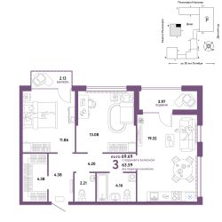 Продается 3комнатная квартира на 9 этаже от застройщика Страна Девелопмент. Площадь квартиры 69,64 кв. м. Стоимость указана без учета акций.