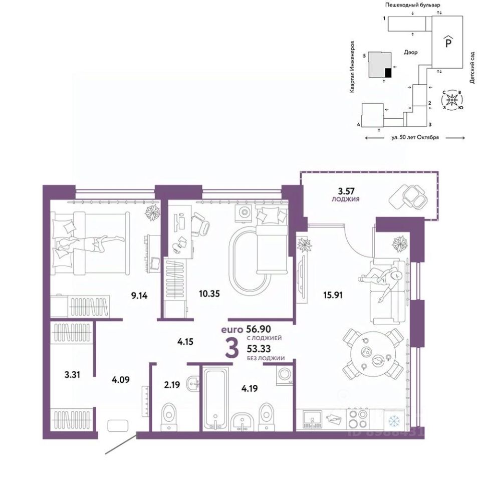 Продается 3комнатная квартира на 13 этаже от застройщика Страна Девелопмент. Площадь квартиры 56,82 кв. м. Стоимость указана без учета акций.