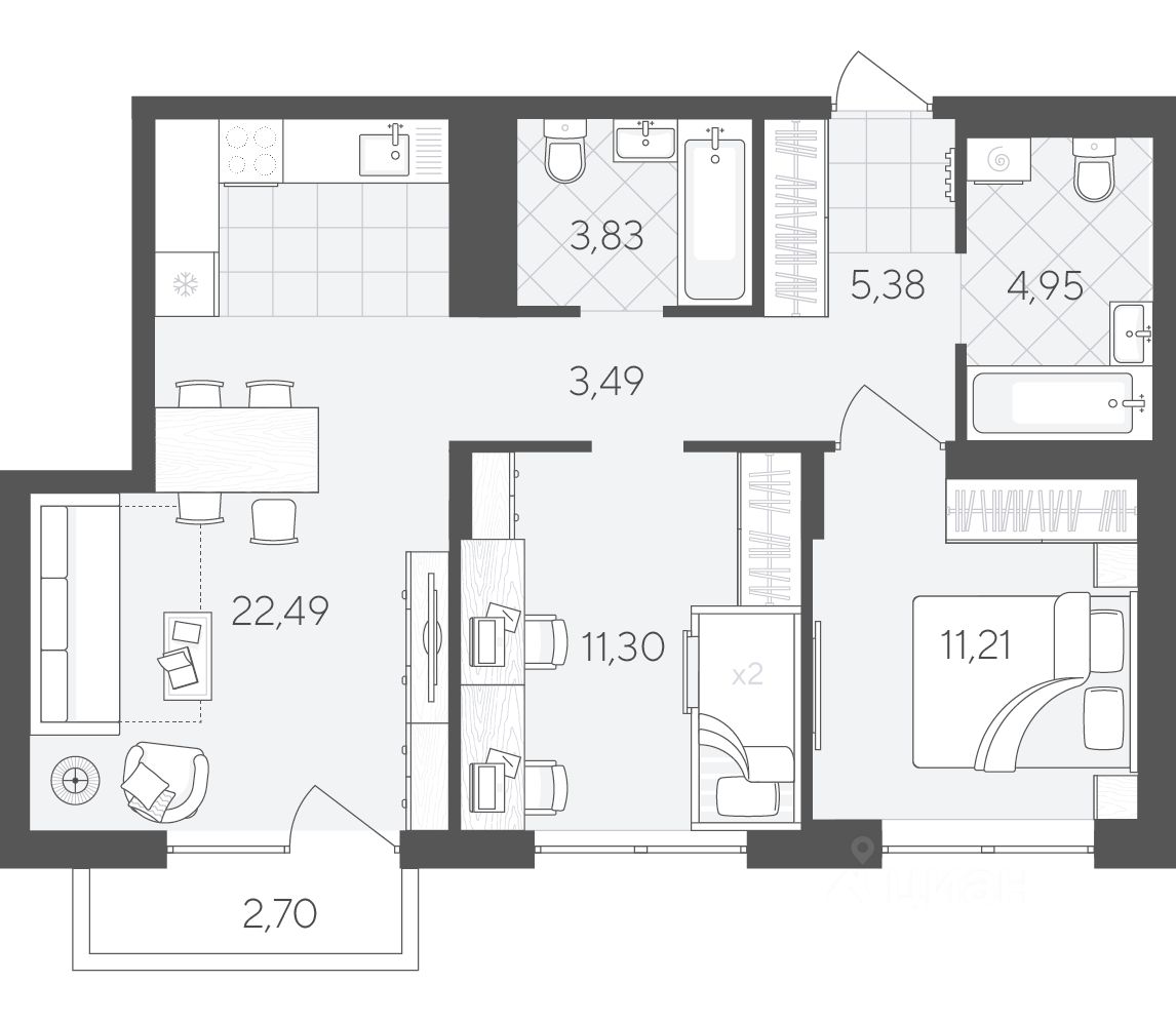Квартира с двумя спальнями площадью 65.35 кв.м на 4 этаже. Продуманная геометрия комнат позволит легко зонировать пространство для личного досуга и места, где удобно проводить время с семьей или встречать гостей.