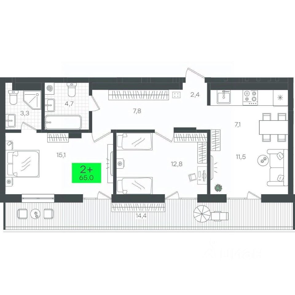 Квартира 2+ с мастер-спальней и террасой на последнем этаже. Выходы на террасу есть из кухни-гостиной и обеих спален. В одной из спален спроектирована отдельная ванная комната. В просторной прихожей можно разместить несколько мест для хранения. В кухне-гостиной предусмотрена ниша под размещение кухонного гарнитура. Терраса расширит возможности для времяпрепровождения дома, здесь можно принимать солнечные ванны, заниматься спортом на свежем воздухе, жарить барбекю и устраивать пикники летом, украшать елку и получать больше витамина D зимой. Гранд Квартал, 2-Д8.2, 15, 2, квартира 156