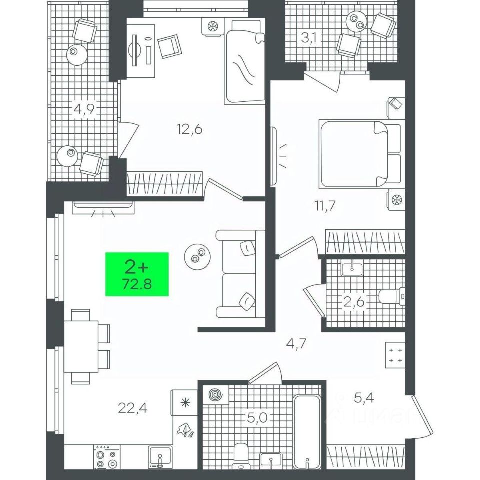 Продаётся 2-комнатная квартира в строящемся доме (В5.3 (Малкова, 19)), срок сдачи: III-кв. 2026, общей площадью 72.86 кв.м., на 1 этаже. Компания 4D приступила к строительству нового жилого комплекса "Гранд квартал". Новый ЖК находится в зеленой зоне Калининского района, южнее микрорайона Тюменская слобода.