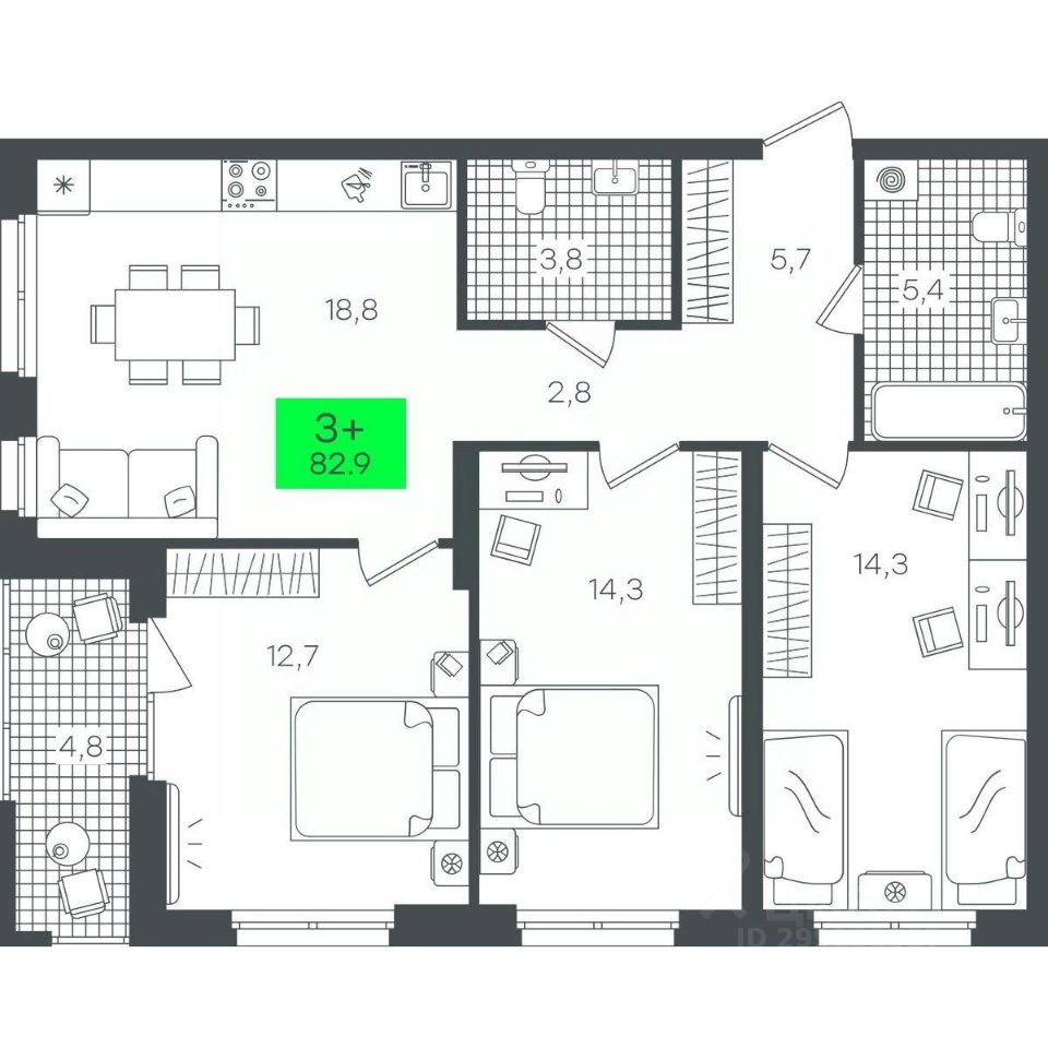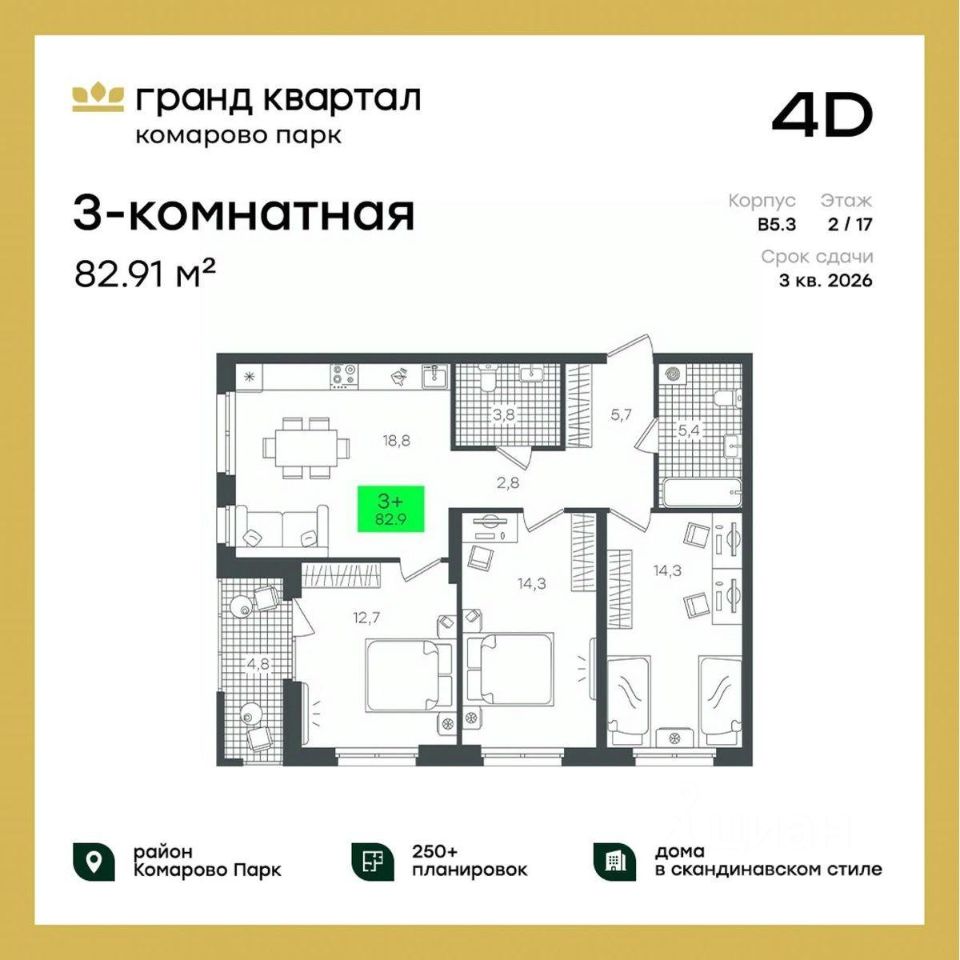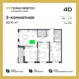 Продаётся 3-комнатная квартира в строящемся доме (В5.3 (Малкова, 19)), срок сдачи: III-кв. 2026, общей площадью 82.91 кв.м., на 2 этаже. Компания 4D приступила к строительству нового жилого комплекса "Гранд квартал". Новый ЖК находится в зеленой зоне Калининского района, южнее микрорайона Тюменская слобода.
