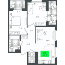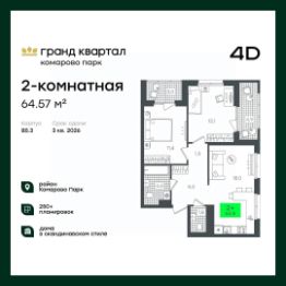 Продаётся 2-комнатная квартира в строящемся доме (В5.3 (Малкова, 19)), срок сдачи: III-кв. 2026, общей площадью 64.57 кв.м., на 16 этаже. Компания 4D приступила к строительству нового жилого комплекса "Гранд квартал". Новый ЖК находится в зеленой зоне Калининского района, южнее микрорайона Тюменская слобода.