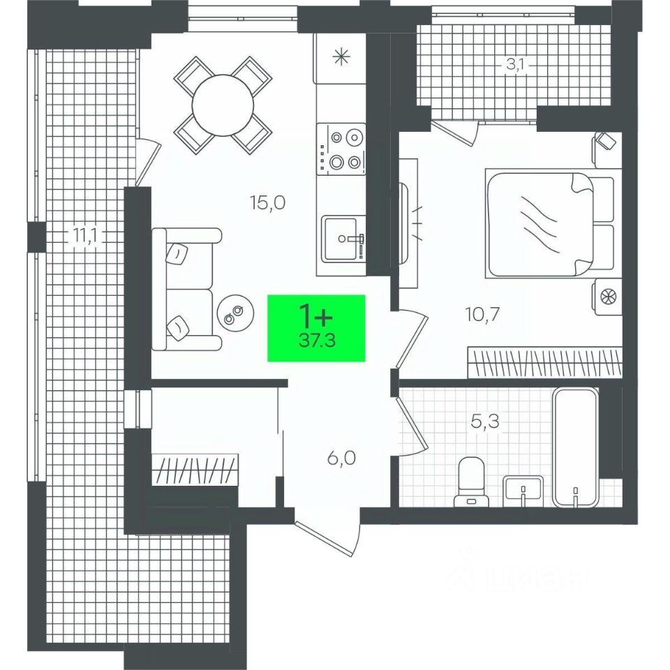 Квартира 1+ с просторной лоджией. Лоджия расширит возможности для для времяпрепровождения в небольшой квартире, здесь можно организовать зону для отдыха и хобби. В прихожей спроектирована вместительная гардеробная с будуарным окном, чтобы одеться или поправить макияж при естественном свете. В кухне-гостиной расположено дополнительное к выходу на лоджию окно, здесь будет много солнечного света. В спальне расположена дополнительная лоджия. Гранд Квартал, 2-Д6.1, 16, 2, квартира 75
