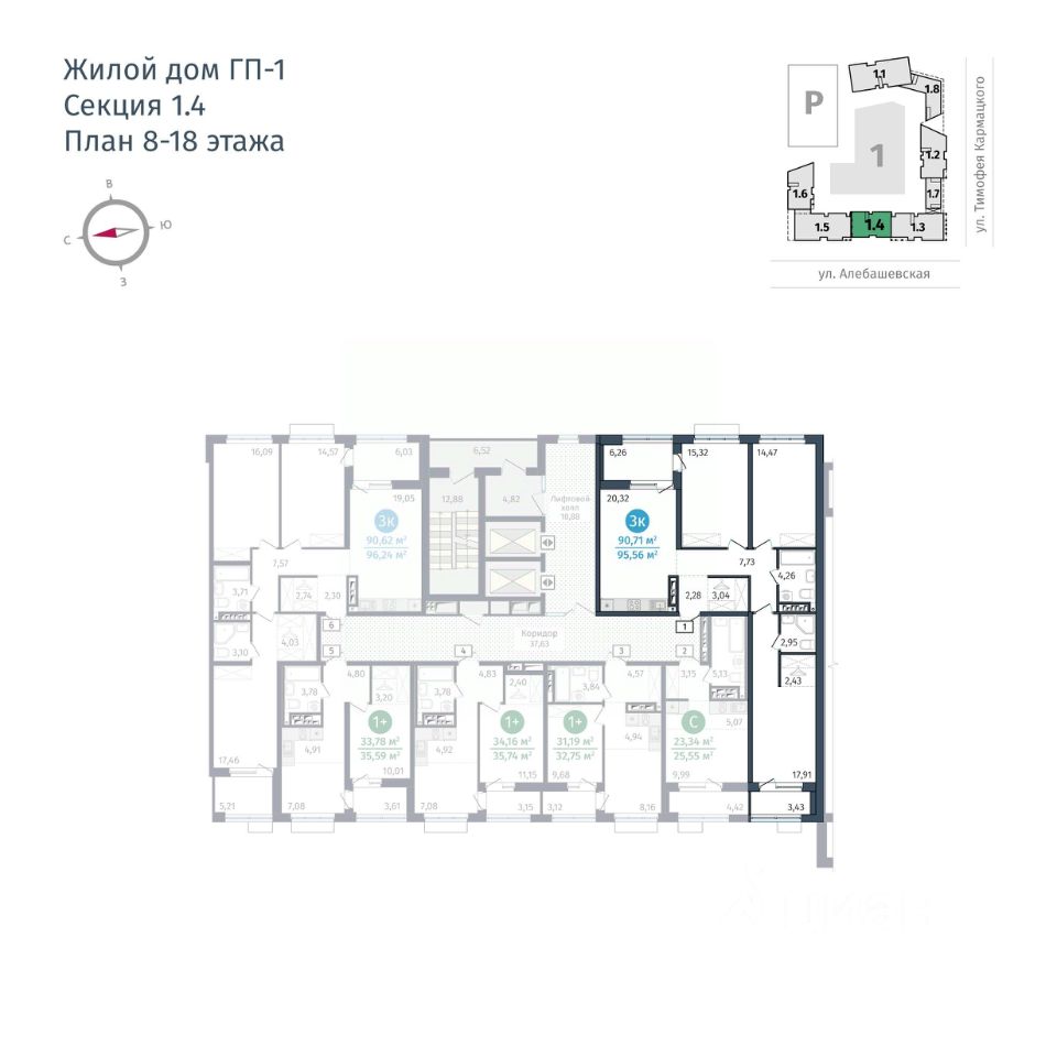 Предлагаем 3 - комнатную квартиру в доме ГП-1 общей площадью: 90,71 кв.м., с типом планировки: Кухня-гостиная.