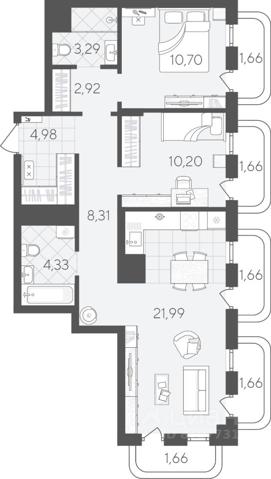 Квартира с 2 спальнями площадью 75,02 кв.м