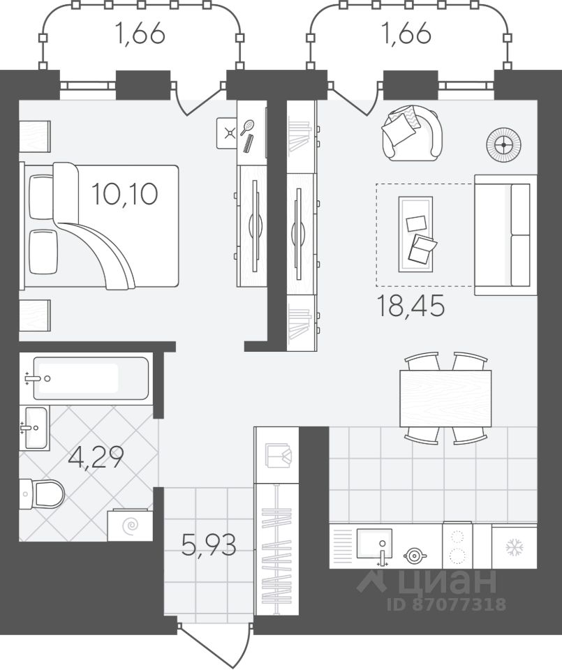 В квартире есть кухня-гостиная и отдельная спальня, предусмотрены ниши под шкафы-купе. Это позволяет оставить больше пространства для жизни.