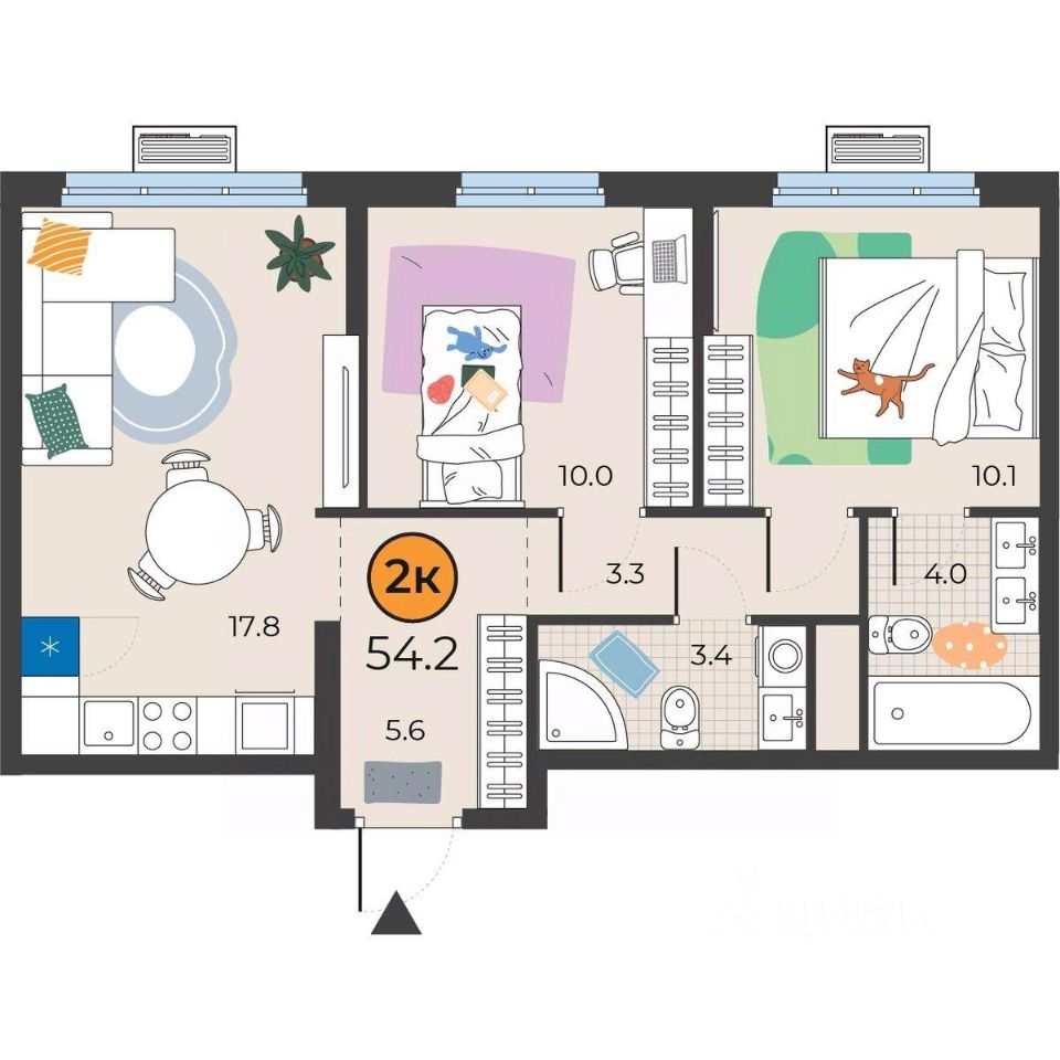Общая площадь54,2 м²