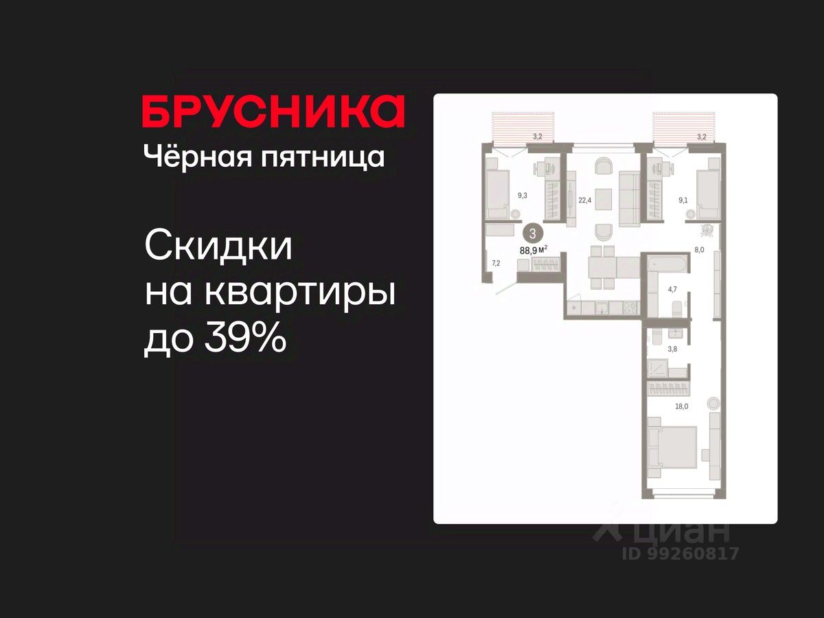 Просторная 3-комн. квартира с предчистовой отделкой в ЖК "Республики 205" на 2 этаже. Общая площадь: 88.87 кв.м., жилая: 36.4 кв.м., площадь просторной кухни-гостиной: 22.4 кв.м. Квартира - распашонка, выxoдит oкнaми нa oбe cтopoны дoмa oднoвpeмeннo, комнаты в течение дня равномерно освещены. В квартире два балкона, два совмещенных санузла. Высота потолков 2.7 м.