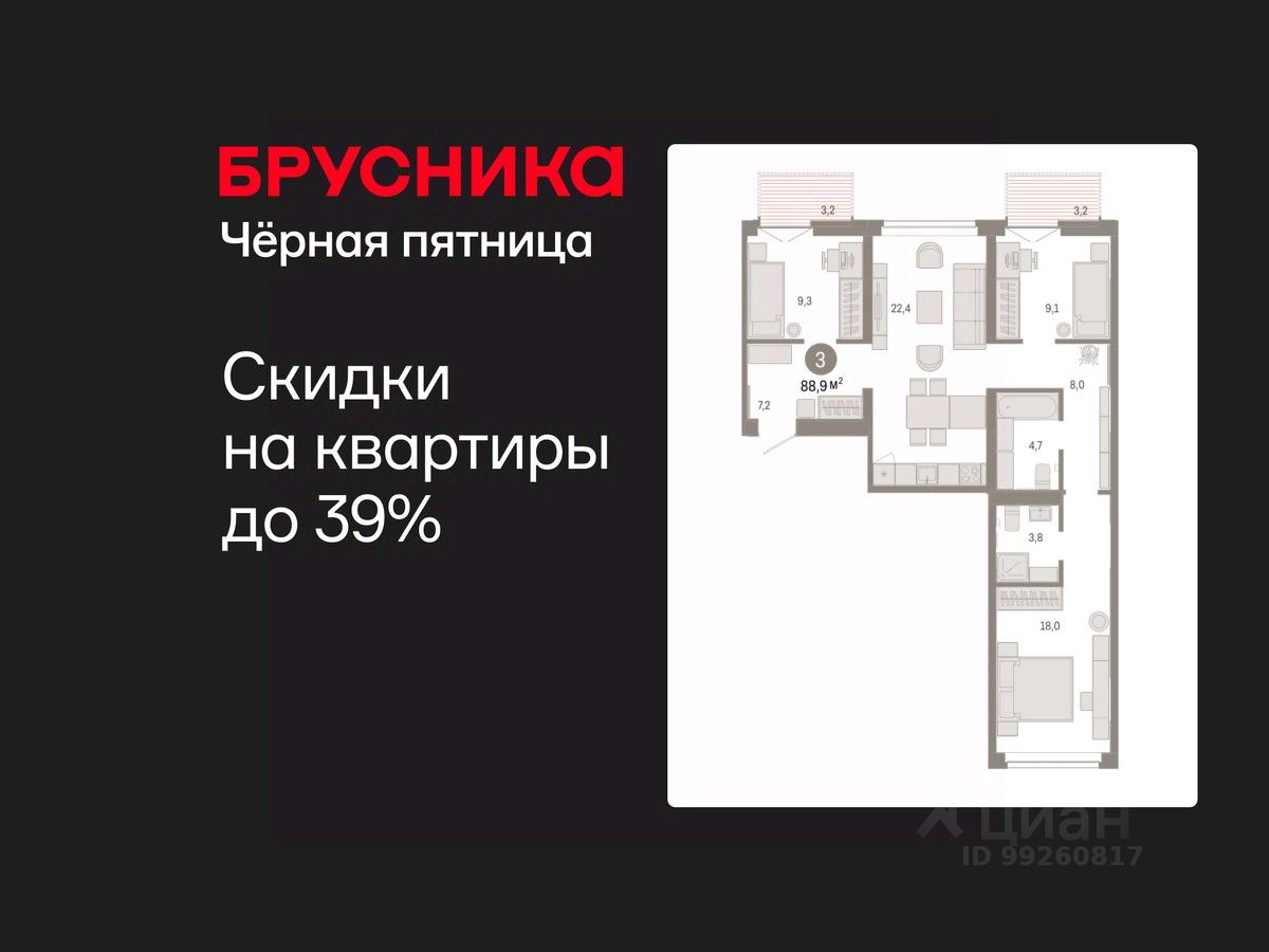 Трехкомнатная квартира с предчистовой отделкой в ЖК "Республики 205" на 4 этаже. Общая площадь: 88.87 кв.м., жилая: 36.4 кв.м., площадь просторной кухни-гостиной: 22.4 кв.м. Квартира - распашонка, без проходных комнат, окна выходят на paзные стороны дома. В квартире два балкона, два совмещенных санузла. Высота потолков 2.7 м.