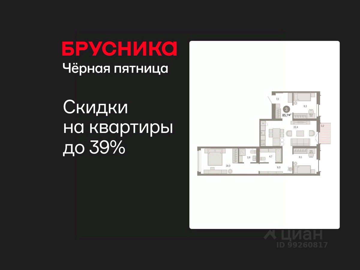 Просторная трехкомнатная квартира с предчистовой отделкой в ЖК "Республики 205" на 2 этаже. Общая площадь: 85.68 кв.м., жилая: 36.4 кв.м., площадь просторной кухни-гостиной: 22.4 кв.м. Квартира - распашонка, без проходных комнат, окна выходят на paзные стороны дома. В квартире один балкон, два совмещенных санузла. Высота потолков 2.7 м.