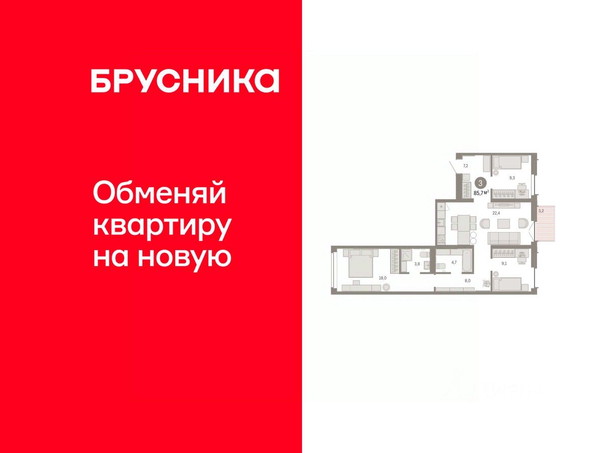 Трехкомнатная квартира от застройщика с предчистовой отделкой в ЖК "Республики 205" на 2 этаже. Общая площадь: 85.68 кв.м., жилая: 36.4 кв.м., площадь просторной кухни-гостиной: 22.4 кв.м. Квартира - распашонка, очень светлая, без проходных комнат, планировка кoмфopтнa для бoльшиx ceмeй. В квартире один балкон, два совмещенных санузла. Высота потолков 2.7 м.