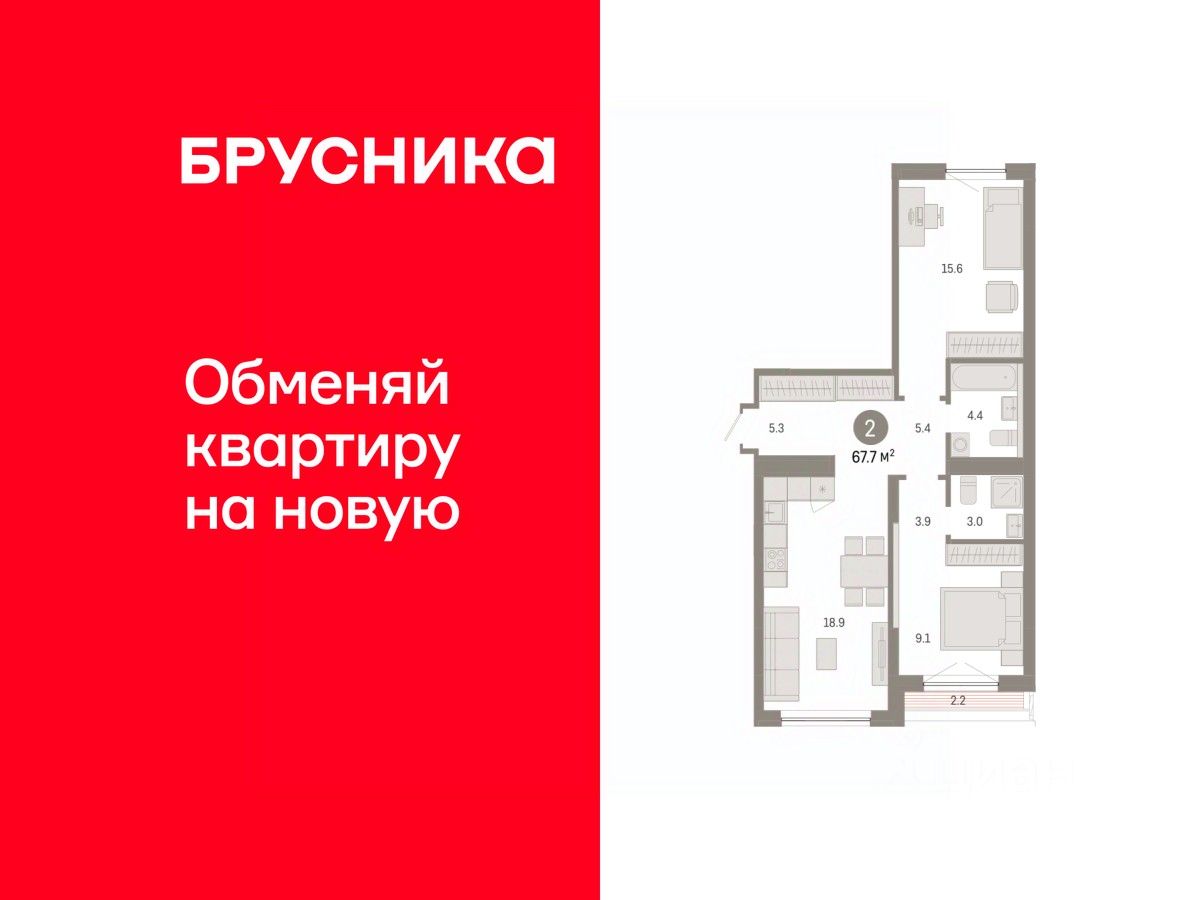 Квартира с кухней-гостиной и двумя спальнями в Октябрьском на Туре. Особенности планировки: балкон, предчистовая отделка, разнесённые спальни, терраса на крыше.