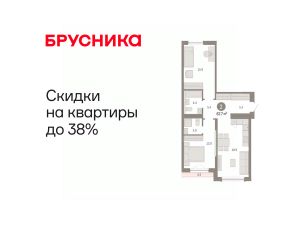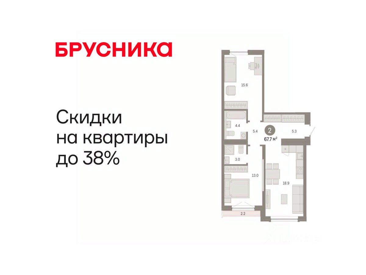 Квартира с кухней-гостиной и двумя спальнями в Октябрьском на Туре. Особенности планировки: гардеробная, вид во двор, разнесённые спальни, предчистовая отделка, мастер-спальня, терраса на крыше.