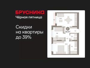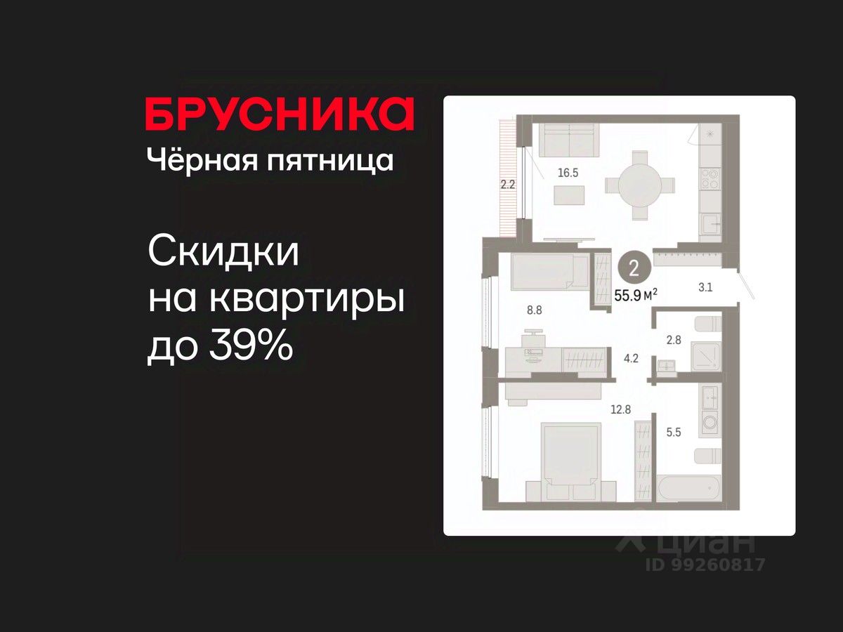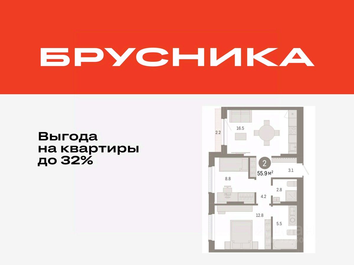 Квартира с кухней-гостиной и двумя спальнями в Октябрьском на Туре. Особенности планировки: второй санузел, предчистовая отделка, мастер-спальня, терраса на крыше.