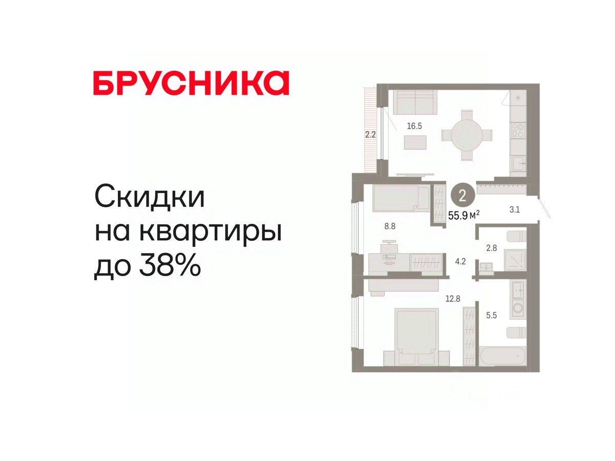 Квартира с кухней-гостиной и двумя спальнями в Октябрьском на Туре. Особенности планировки: второй санузел, мастер-спальня, предчистовая отделка, терраса на крыше.