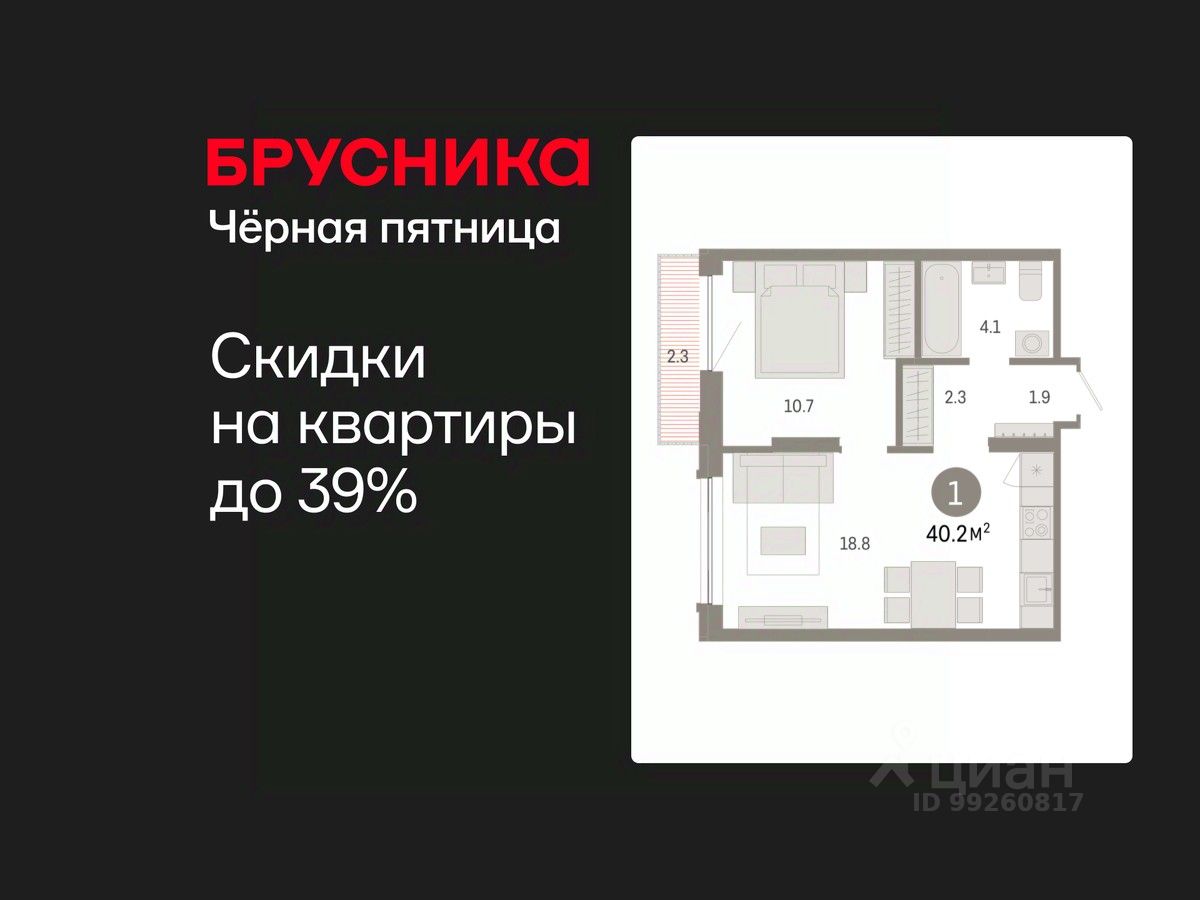 Квартира с кухней-гостиной и одной спальней в Октябрьском на Туре. Особенности планировки: предчистовая отделка, балкон.