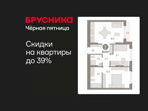 Квартира с кухней-гостиной и двумя спальнями в Октябрьском на Туре. Особенности планировки: второй санузел, предчистовая отделка, мастер-спальня, терраса на крыше.