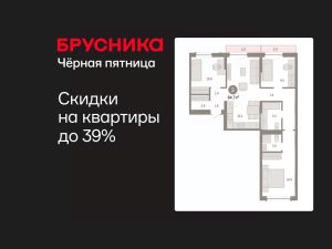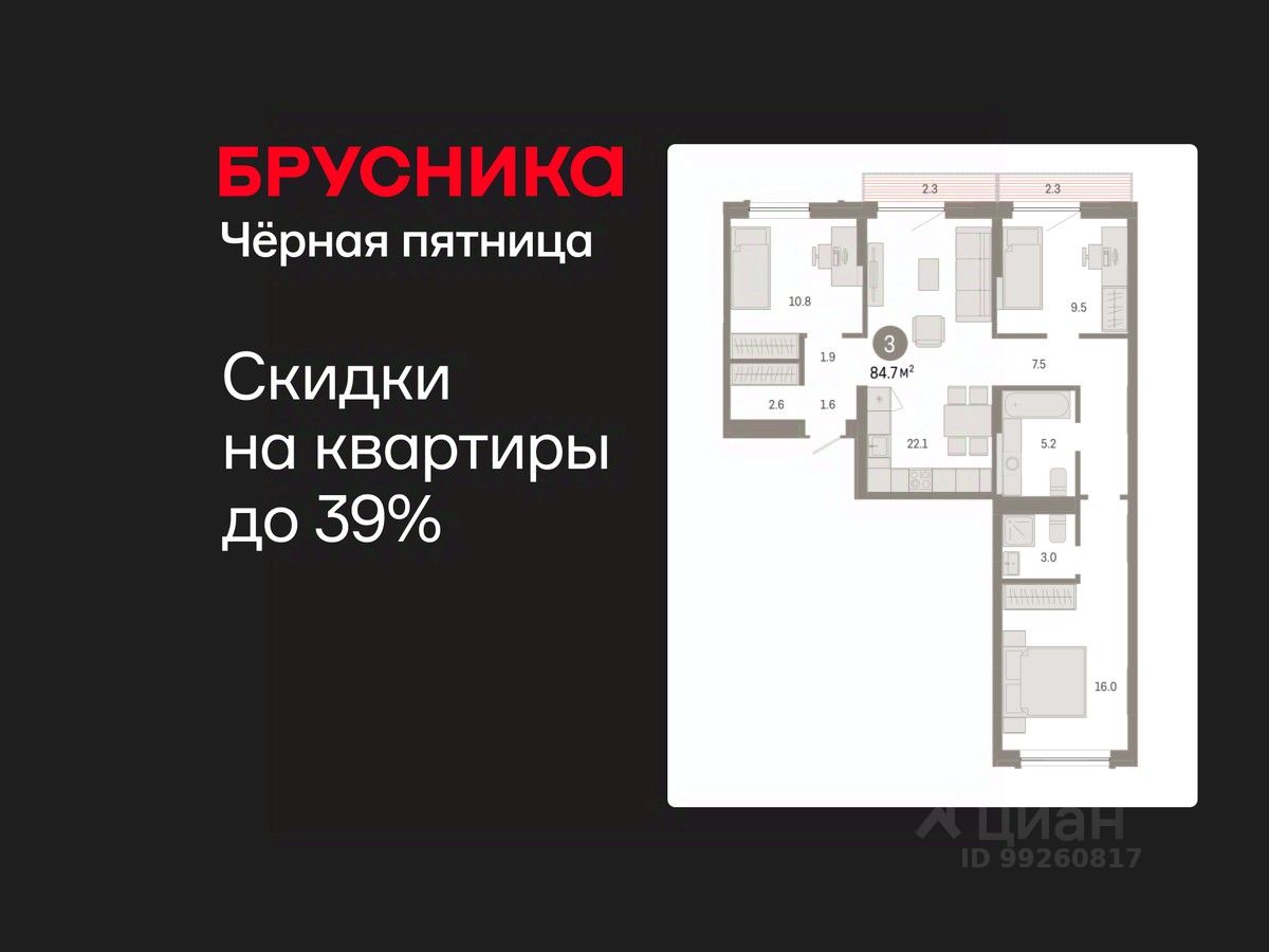 Квартира с кухней-гостиной и тремя спальнями в Октябрьском на Туре. Особенности планировки: гардеробная, вид во двор, разнесённые спальни, предчистовая отделка, мастер-спальня, балкон.