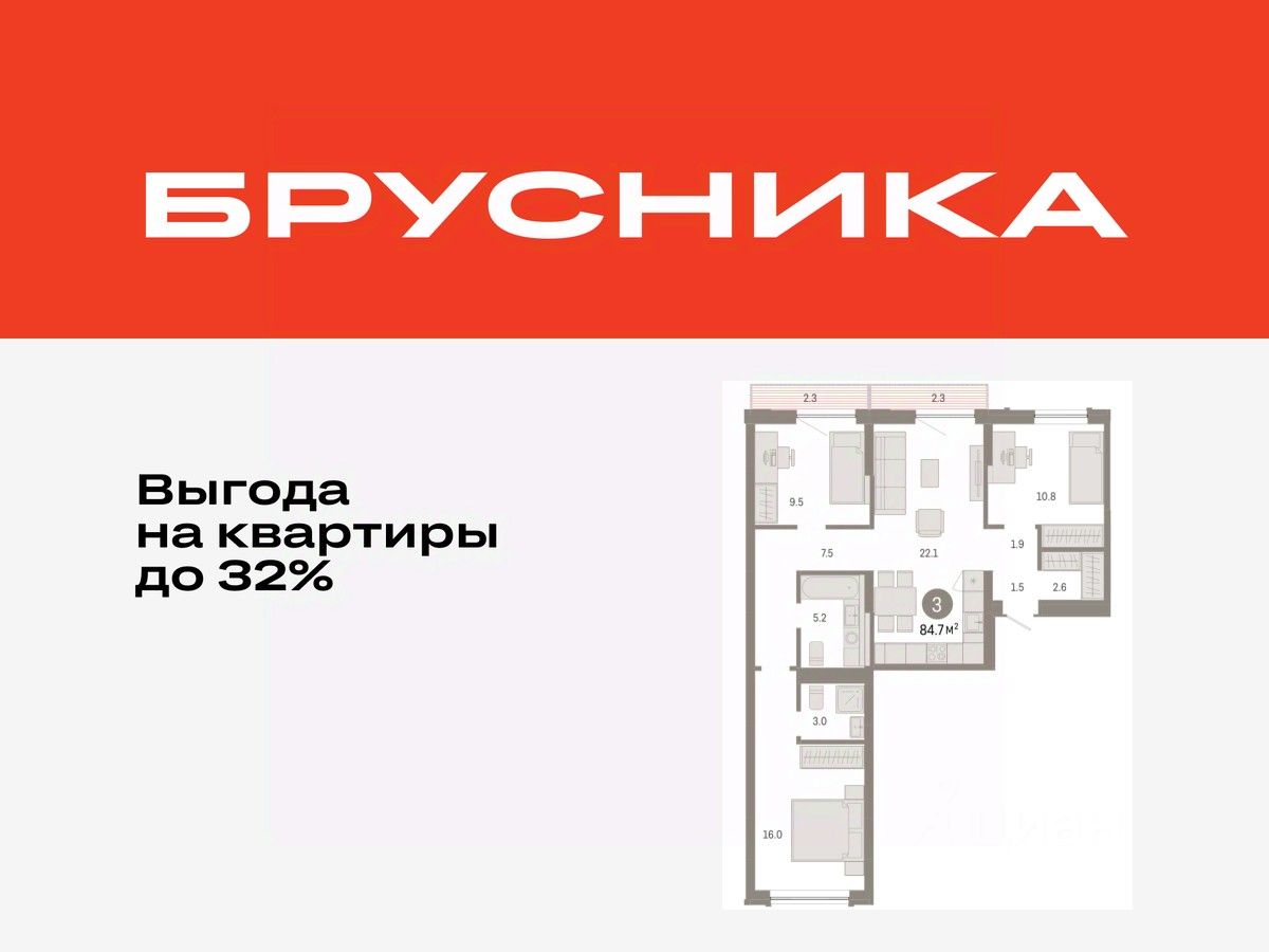 Квартира с кухней-гостиной и тремя спальнями в Октябрьском на Туре. Особенности планировки: гардеробная, вид во двор, разнесённые спальни, предчистовая отделка, мастер-спальня, балкон.
