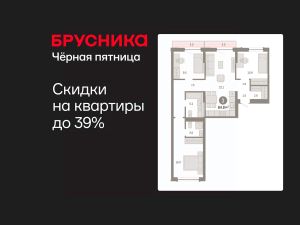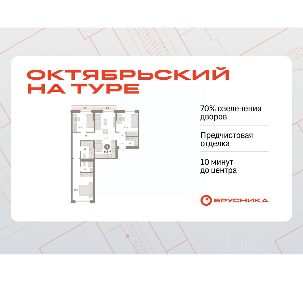 Квартира с кухней-гостиной и тремя спальнями в Октябрьском на Туре. Особенности планировки: гардеробная, вид во двор, разнесённые спальни, предчистовая отделка, мастер-спальня, балкон.