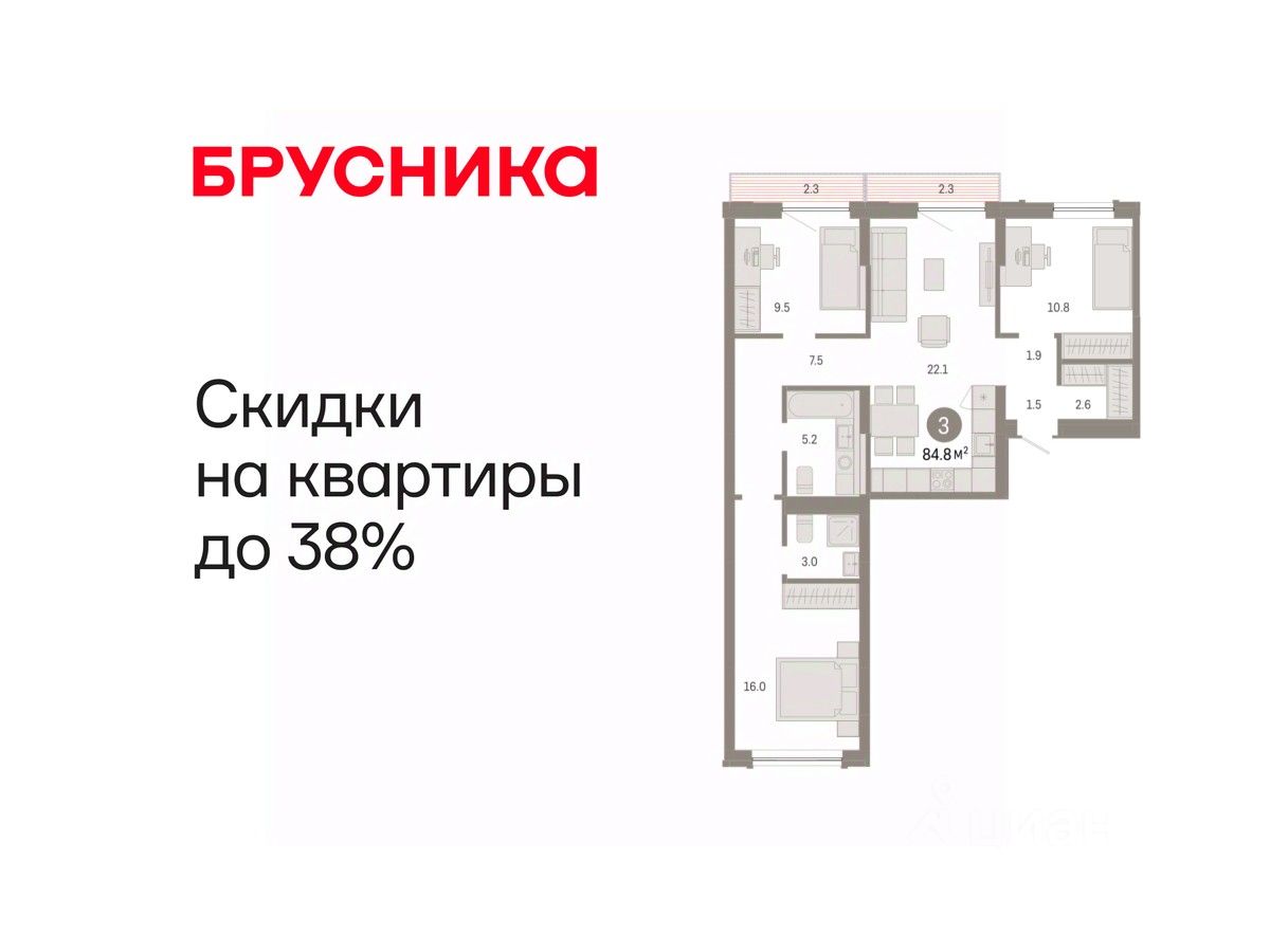 Квартира с кухней-гостиной и тремя спальнями в Октябрьском на Туре. Особенности планировки: балкон, вид во двор, гардеробная, мастер-спальня, предчистовая отделка, разнесённые спальни.