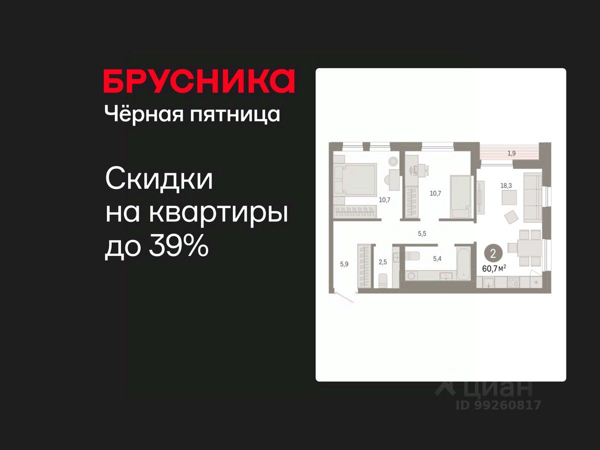 Двухкомнатная квартира с предчистовой отделкой в ЖК "Республики 205" на 16 этаже. Общая площадь: 60.68 кв.м., жилая: 21.4 кв.м., площадь просторной кухни-гостиной: 18.3 кв.м. Квартира угловая, очень светлая, естественная вентиляция при открытии окон. В квартире одна лоджия, один совмещенный и один раздельный санузел. Высота потолков 2.6 м.