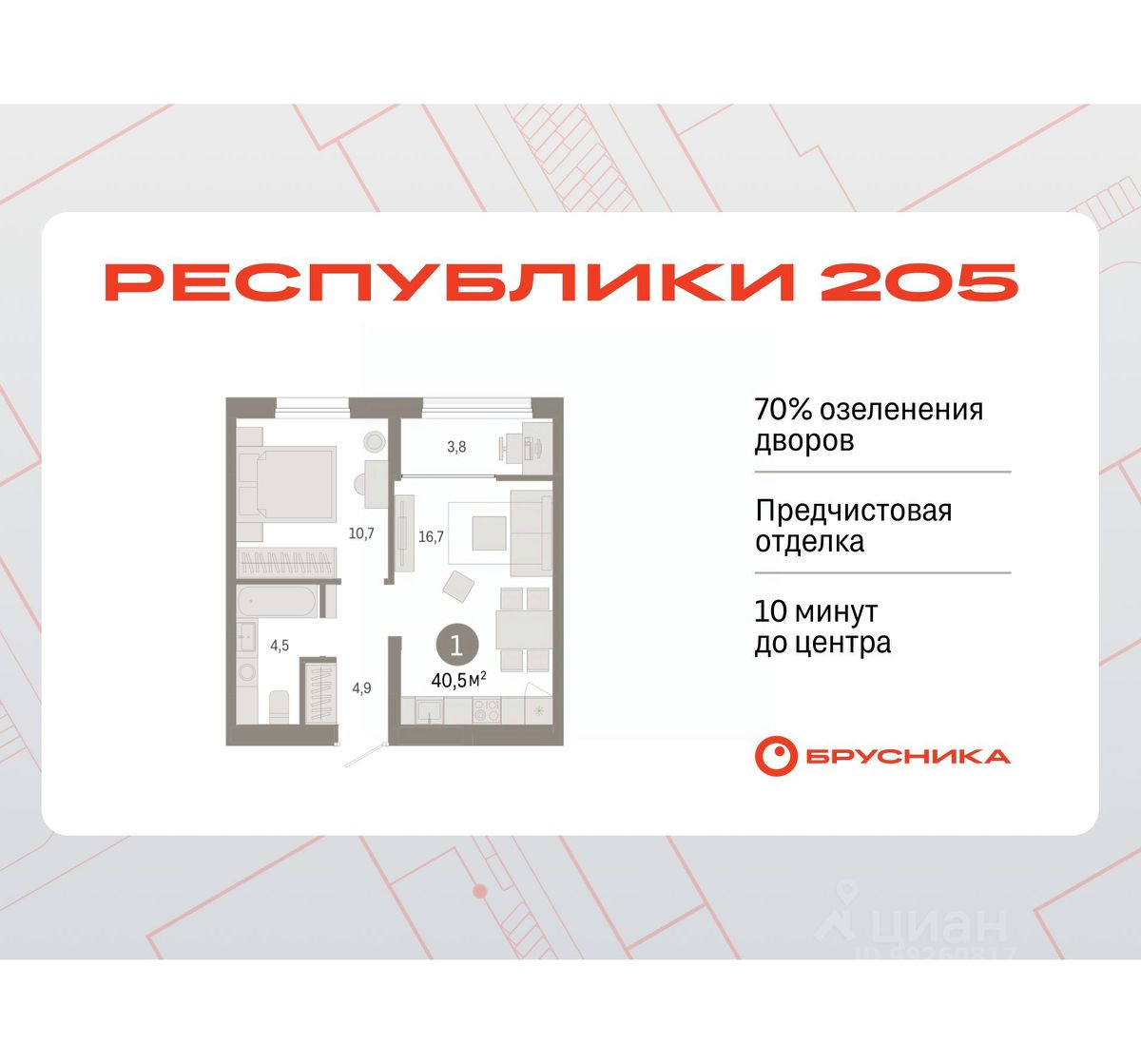 Однокомнатная квартира от застройщика с предчистовой отделкой в ЖК "Республики 205" на 9 этаже. Общая площадь: 40.49 кв.м., жилая: 10.7 кв.м., площадь просторной кухни-гостиной: 16.7 кв.м. Все окна выходят на одну сторону. В квартире одна лоджия, один совмещенный санузел. Высота потолков 2.6 м.