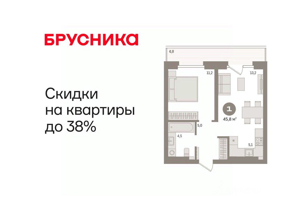 Квартира с кухней-гостиной и одной спальней в жилом районе "Речной порт". Особенности планировки: балкон, вид во двор, окна в пол, предчистовая отделка.