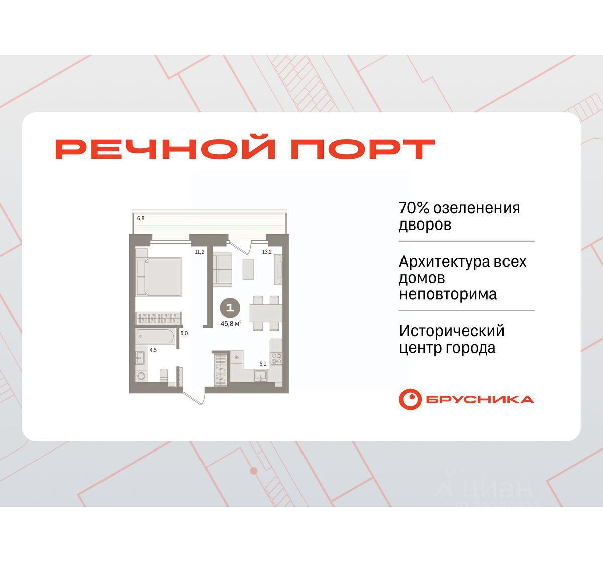 Квартира с кухней-гостиной и одной спальней в жилом районе "Речной порт". Особенности планировки: окна в пол, вид во двор, предчистовая отделка, балкон.