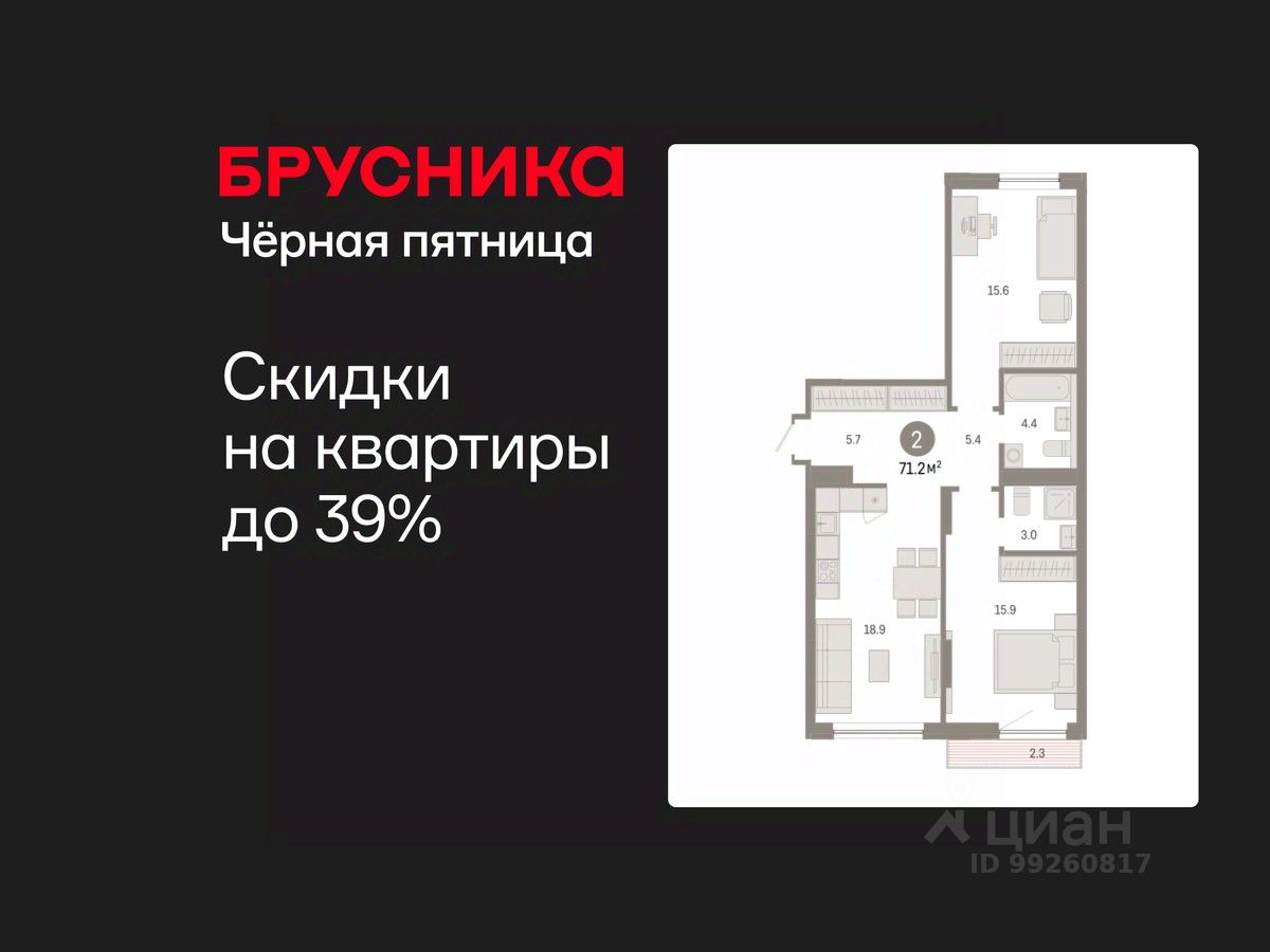 Квартира с кухней-гостиной и двумя спальнями в Октябрьском на Туре. Особенности планировки: второй санузел, гардеробная, вид во двор, разнесённые спальни, предчистовая отделка, мастер-спальня, балкон.