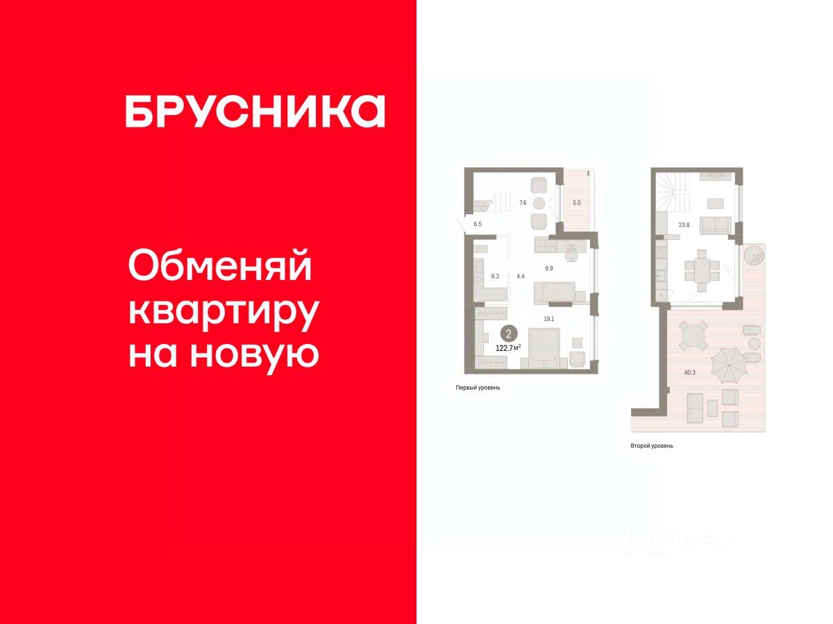 Двухуровневая квартира с кухней-гостиной и двумя спальнями в Октябрьском на Туре. Особенности планировки: двухуровневая, мастер-спальня, свободная планировка, терраса на крыше.