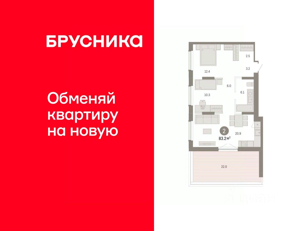 Квартира с кухней-гостиной и двумя спальнями в Октябрьском на Туре. Особенности планировки: гардеробная, мастер-спальня, предчистовая отделка, терраса на крыше.