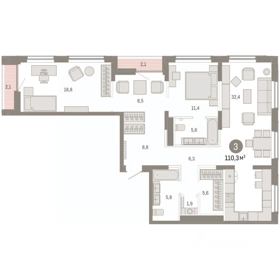 Квартира с кухней-гостиной и тремя спальнями в Октябрьском на Туре. Особенности планировки: без отделки, вид на реку, свободная планировка, лоджия, мастер-спальня, постирочная.