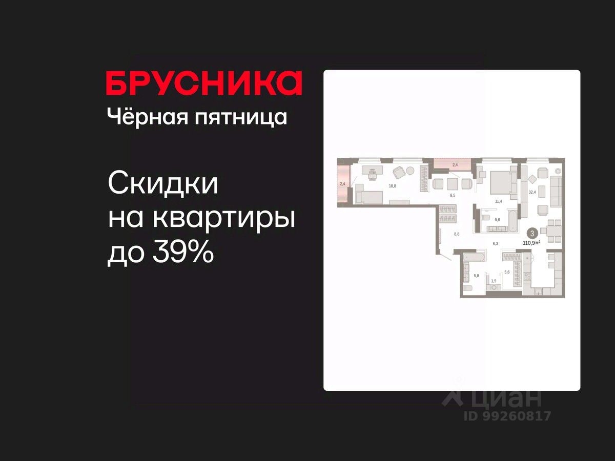 Квартира с кухней-гостиной и тремя спальнями в Октябрьском на Туре. Особенности планировки: без отделки, свободная планировка, лоджия, мастер-спальня, постирочная.