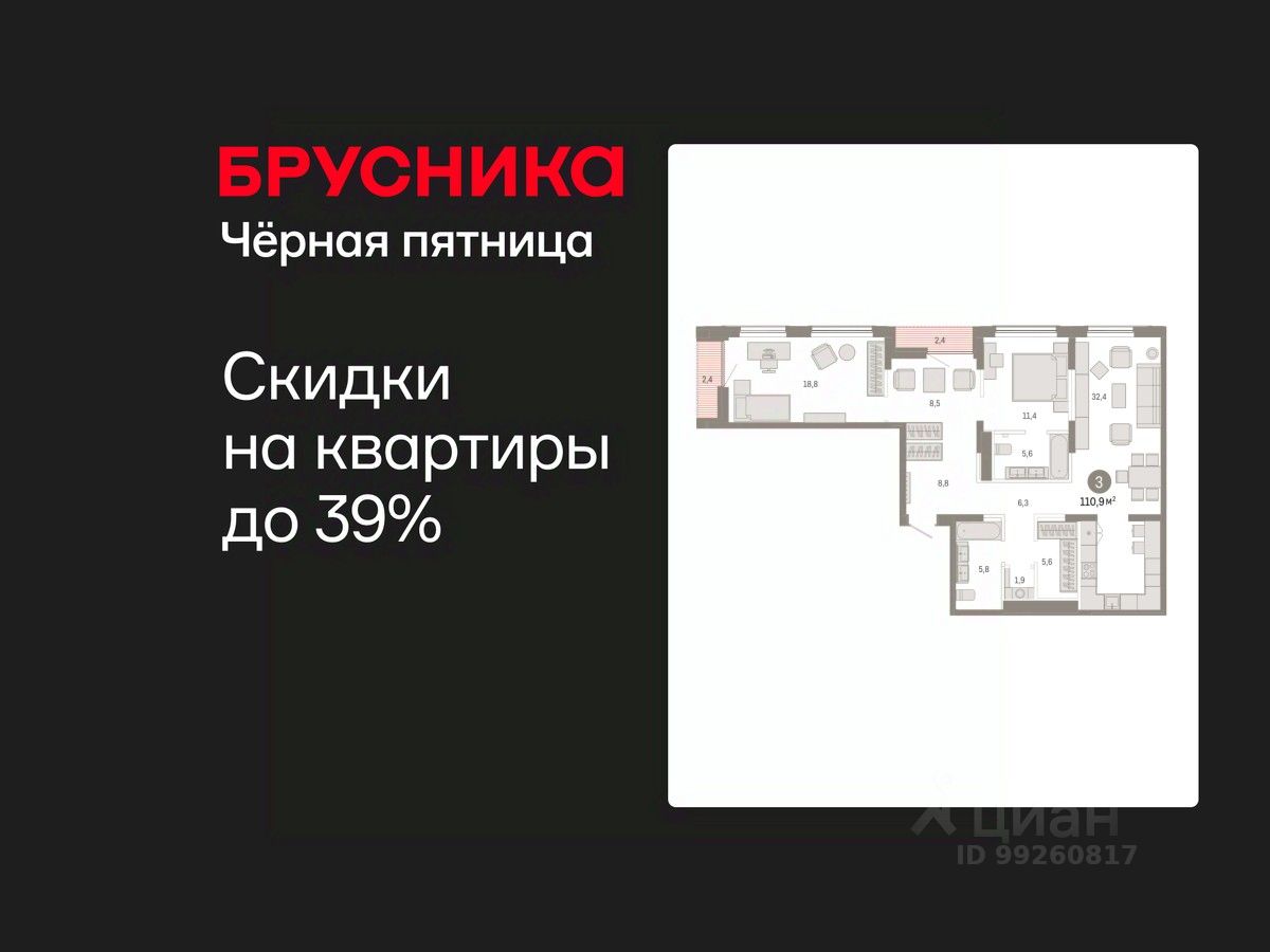Квартира с кухней-гостиной и тремя спальнями в Октябрьском на Туре. Особенности планировки: без отделки, свободная планировка, лоджия, мастер-спальня, постирочная.