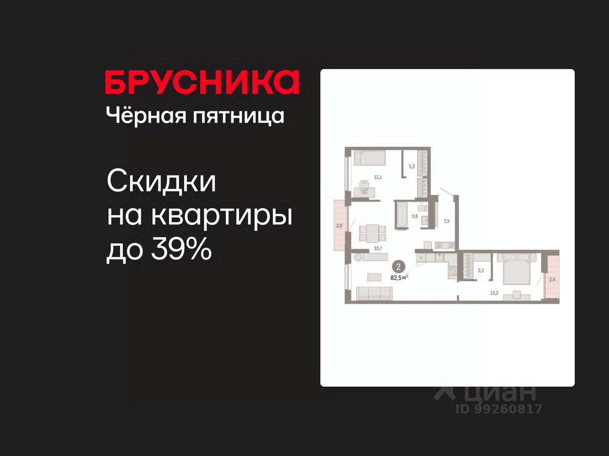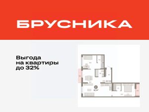 Квартира с кухней-гостиной и двумя спальнями в Октябрьском на Туре. Особенности планировки: вид во двор, лоджия, разнесённые спальни, предчистовая отделка, мастер-спальня, балкон.