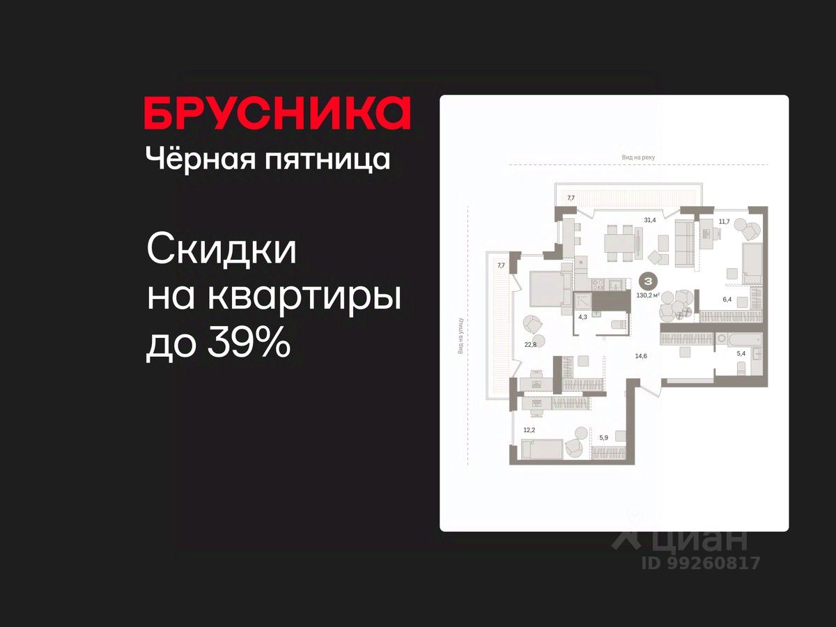 Квартира с кухней-гостиной и тремя спальнями в Октябрьском на Туре. Особенности планировки: гардеробная, окна в пол, без отделки, вид на реку, вид во двор, свободная планировка, мастер-спальня, терраса, терраса на крыше.
