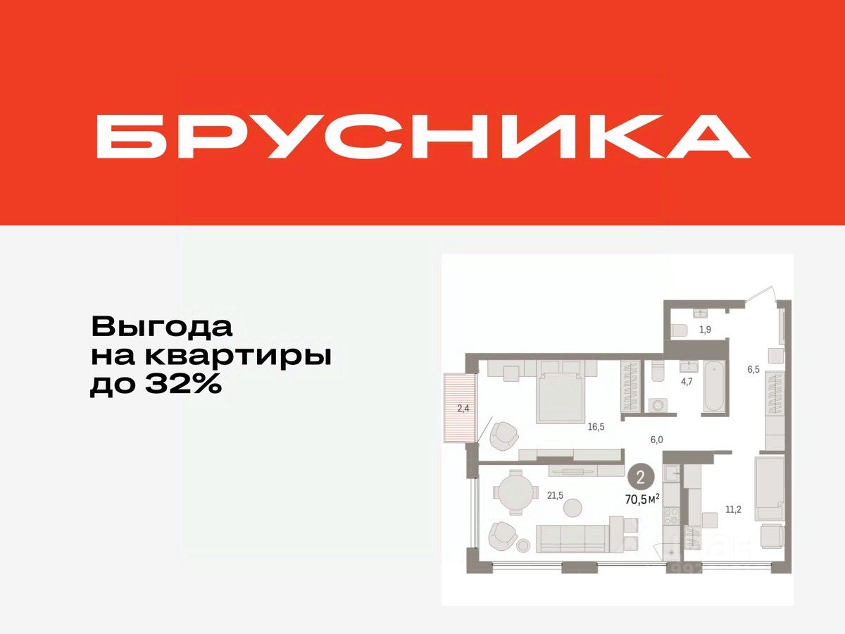 Квартира с кухней-гостиной и двумя спальнями в Октябрьском на Туре. Особенности планировки: второй санузел, вид во двор, предчистовая отделка, балкон.