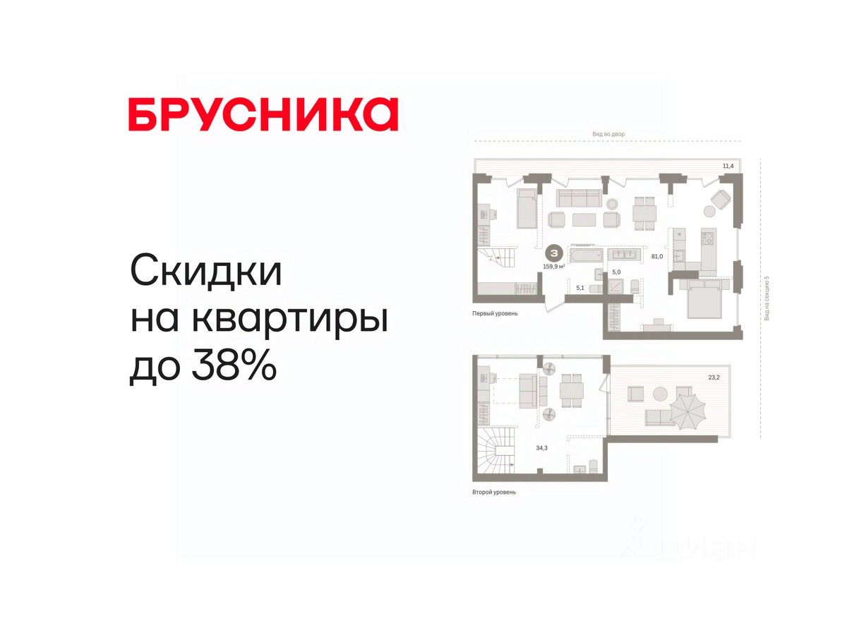Двухуровневая квартира с кухней-гостиной и тремя спальнями в жилом районе "Речной порт". Особенности планировки: вид во двор, двухуровневая, окна в пол, свободная планировка, терраса, терраса на крыше.