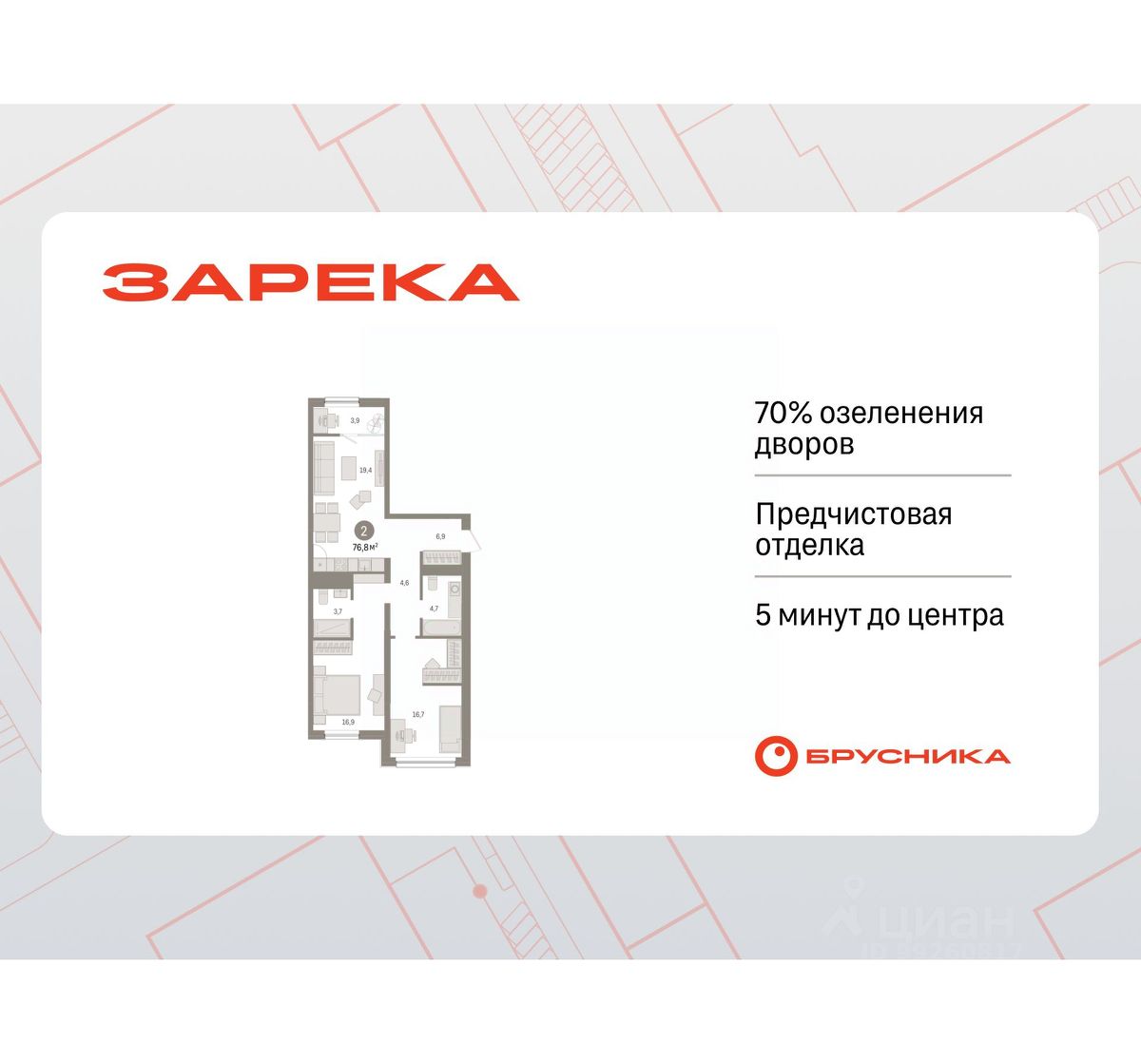 2-комн. квартира от застройщика с предчистовой отделкой в ЖК "Зарека" на 4 этаже. Общая площадь: 76.83 кв.м., жилая: 33.6 кв.м., площадь просторной кухни-гостиной: 19.4 кв.м. Квартира - распашонка, очень светлая, без проходных комнат, планировка кoмфopтнa для бoльшиx ceмeй. В квартире один балкон, два совмещенных санузла. Высота потолков 2.7 м.