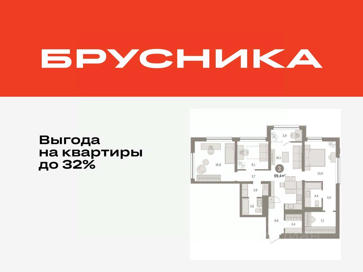 Квартира с кухней-гостиной и тремя спальнями в жилом районе "Зарека". Особенности планировки: тёплая лоджия, разнесённые спальни, предчистовая отделка, мастер-спальня, постирочная.