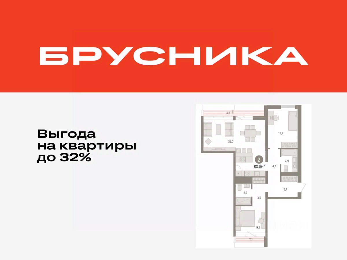 Квартира с кухней-гостиной и двумя спальнями в жилом районе "Зарека". Особенности планировки: вид во двор, разнесённые спальни, предчистовая отделка, мастер-спальня, терраса, терраса на крыше.