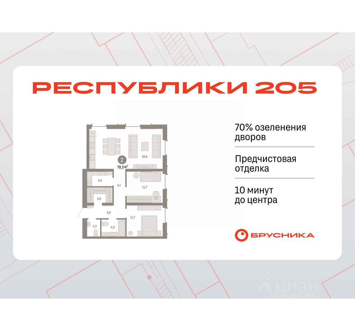 2-комн. квартира с предчистовой отделкой в ЖК "Республики 205" на 12 этаже. Общая площадь: 78.49 кв.м., жилая: 23.4 кв.м., площадь просторной кухни-гостиной: 30.6 кв.м. Угловая квартира, идеально подойдет любителям тишины и панорамных видов. В квартире один совмещенный и один раздельный санузел. Высота потолков 2.7 м.