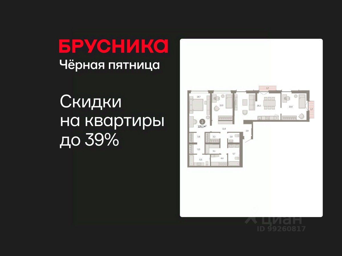 3-комн. квартира с предчистовой отделкой в ЖК "Республики 205" на 6 этаже. Общая площадь: 125.09 кв.м. Высота потолков 2.7 м.