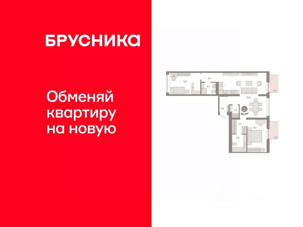 2-комн. квартира с предчистовой отделкой в ЖК "Республики 205" на 2 этаже. Общая площадь: 95.4 кв.м. Высота потолков 2.7 м.