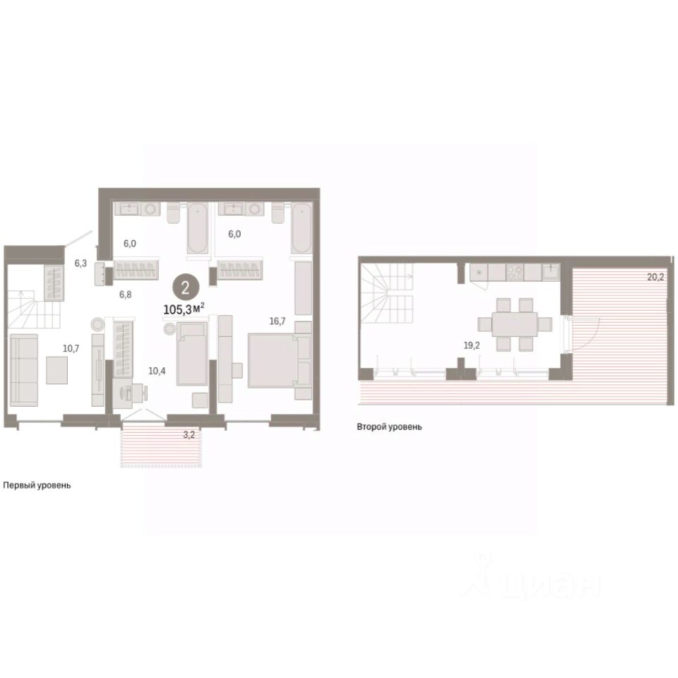 2-комн. квартира от застройщика с предчистовой отделкой в ЖК "Республики 205" на 8 этаже. Общая площадь: 105.32 кв.м. Высота потолков 2.7 м.