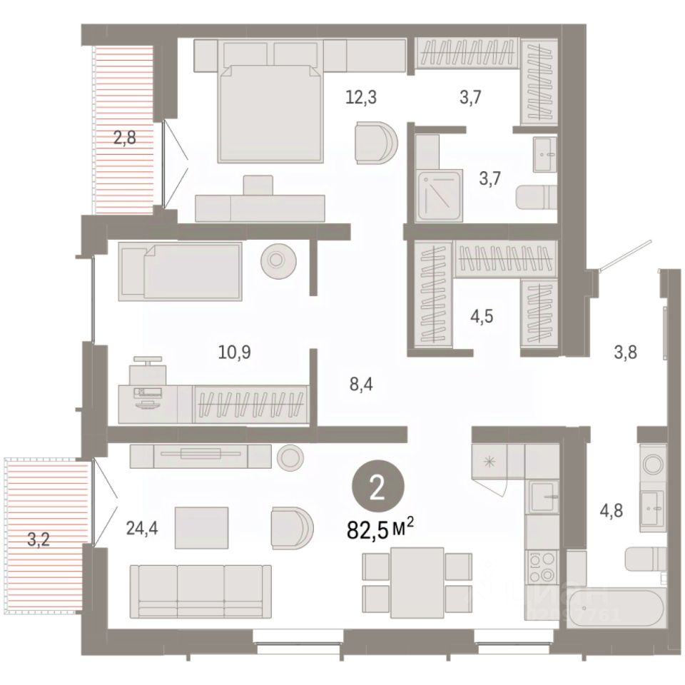 Просторная двухкомнатная квартира с предчистовой отделкой в ЖК "Республики 205" на 15 этаже. Общая площадь: 82.53 кв.м., жилая: 23.2 кв.м., площадь просторной кухни-гостиной: 24.4 кв.м. Угловая квартира, идеально подойдет любителям тишины и панорамных видов. В квартире один балкон и одна лоджия, два совмещенных санузла. Высота потолков 2.7 м.